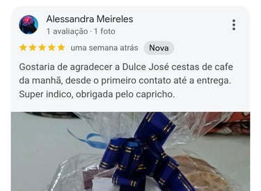Desde 2020, a Dulce Joie tem o propósito de transformar gestos simples em grandes emoções. Com carinho e dedicação, criamos Cestas de Café da Manhã que encantam e tornam momentos especiais inesquecíveis. Nossas cestas são ideais para aniversários, casamentos, noivados, Dia dos Pais, das Mães, dos Namorados e muitas outras comemorações. Cada entrega carrega o desejo de espalhar alegria e afeto, e é isso que nos move todos os dias. Realizamos entregas em diversos bairros do Rio de Janeiro (consulte as condições). Confira nosso cardápio e descubra o presente perfeito para surpreender quem você ama.