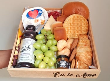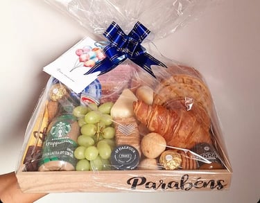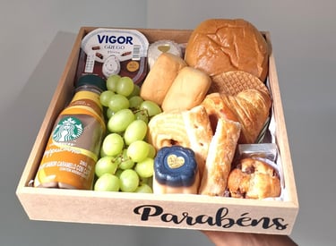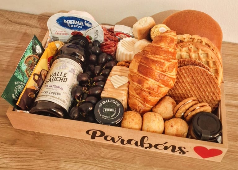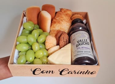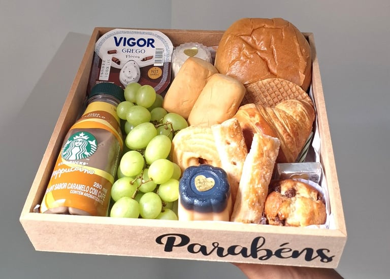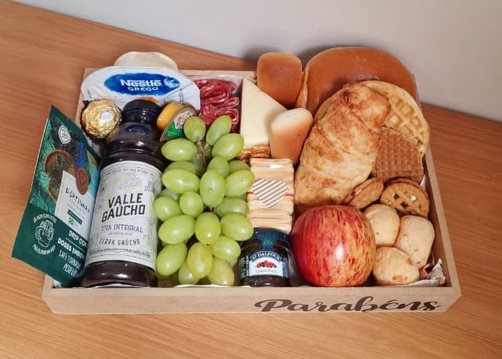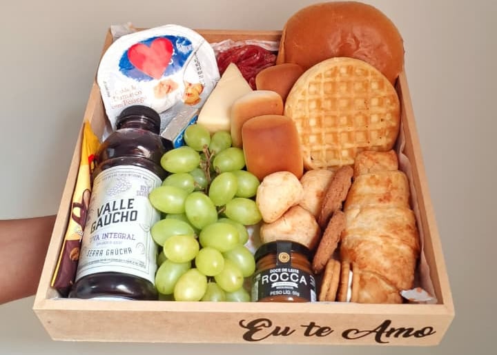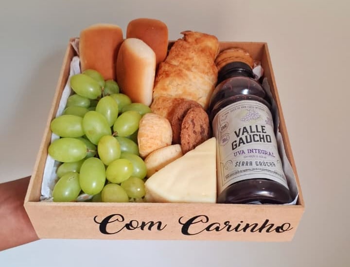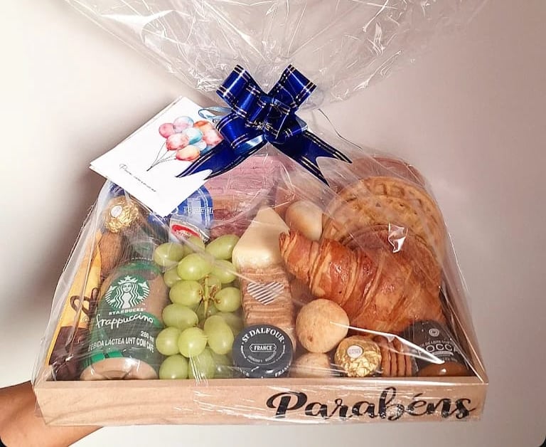 A Cesta Carinho inclui suco 300 ml (ou Frappuccino 280ml), sachê de drip coffee, geleia ou doce de leite, frutas da estação, um queijo, uma charcutaria, torradinhas, um bombom Ferrero Rocher, waffle, stroopwafel, iogurte, queijinho, biscoitos, croissant amanteigado, pães de queijo recheados e pães. Tudo é disposto em uma cesta MDF 30x20, com embalagem em celofane, laço e cartão para aquele recado especial.