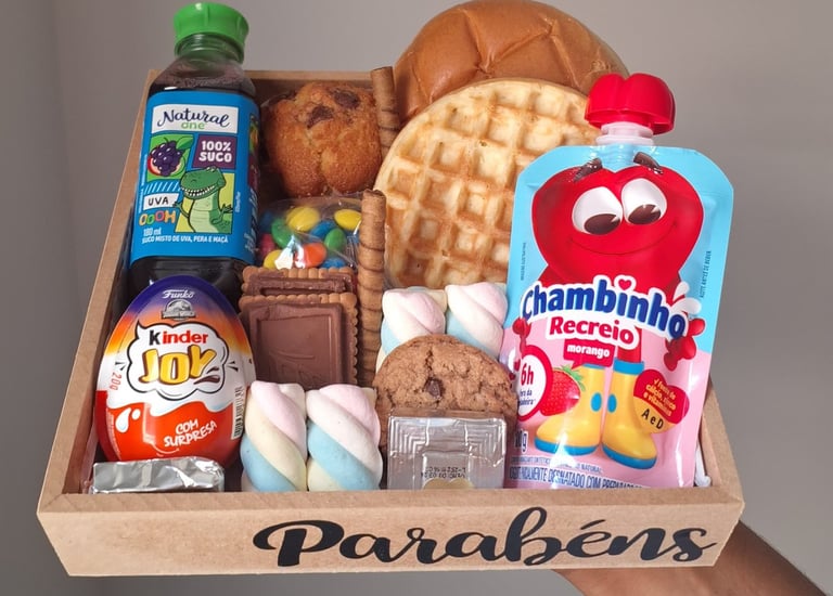 A Cesta Kids é montada em uma cesta MDF 20x20, com embalagem em celofane e cartão para mensagem personalizada. Ela inclui suco 180 ml, iogurte, mini vela, M&Ms, waffle, finis marshmallow, muffin, 2 polenguinhos , biscoitos, kinder ovo e pão